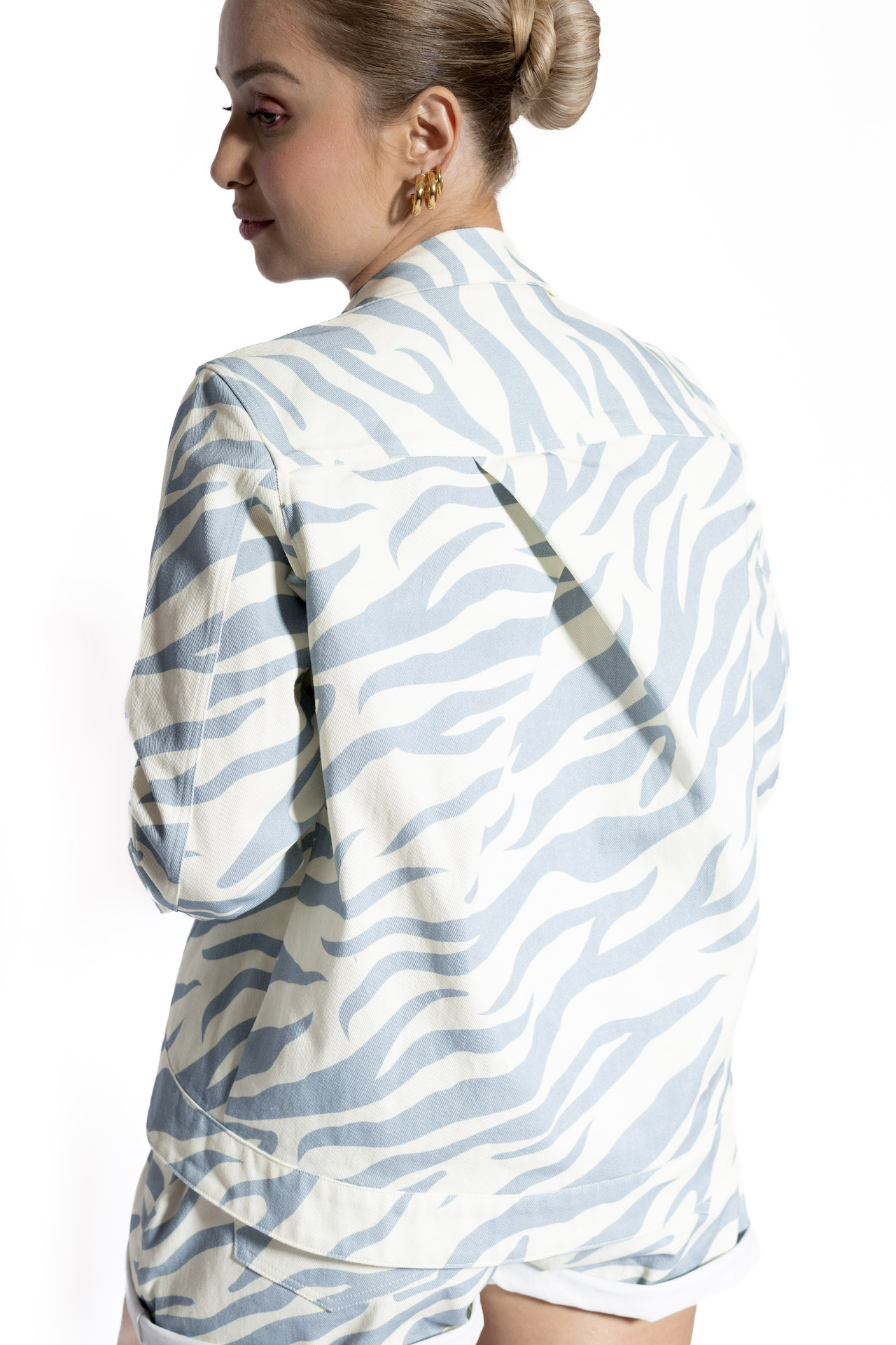 A nossa Jaqueta Vintage faz conjunto com o nosso Shorts Vintage, com o mesmo tecido. A ideia era uma pegada mais antiga e demos um toque especial para deixar a nossa cara. Ela tem uma prega nas costas bem profunda, isso faz com que ela tenha volume nas costas, e a prega é embutida na pala. Na parte da frente ela é bem classicona, tem bolso chapado, com a lapela embutida na pala e fechamento com botões flexíveis de metal. É uma jaqueta mais curta na frente e mais comprida nas costas. Ela não é over, nem muito largona, o único volume é da prega nas costas, dá a impressão que ela é mais bufante no corpo, mas na manga mais certinha. Uma jaqueta assim você nunca viu né?
