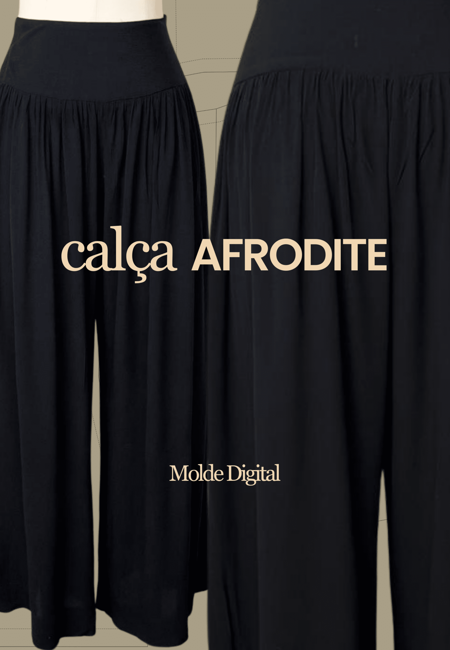 Calça pantalona Afrodite, ampla com franzido e pala larga.