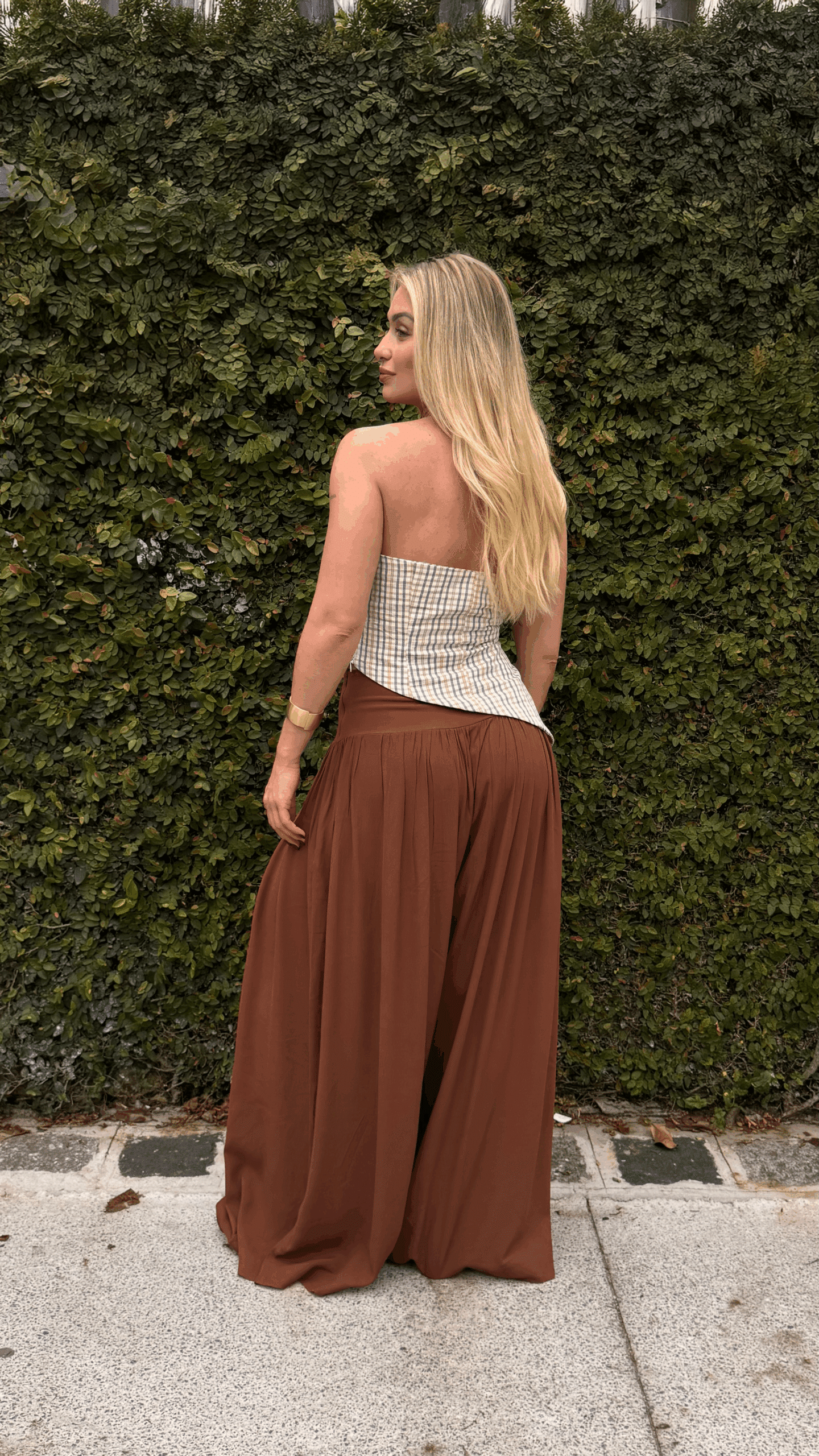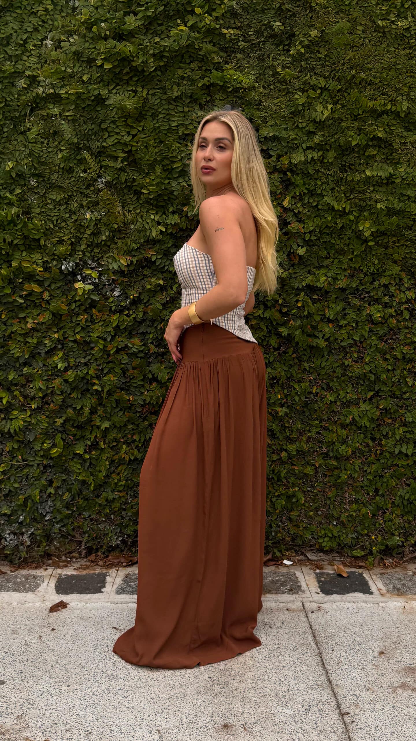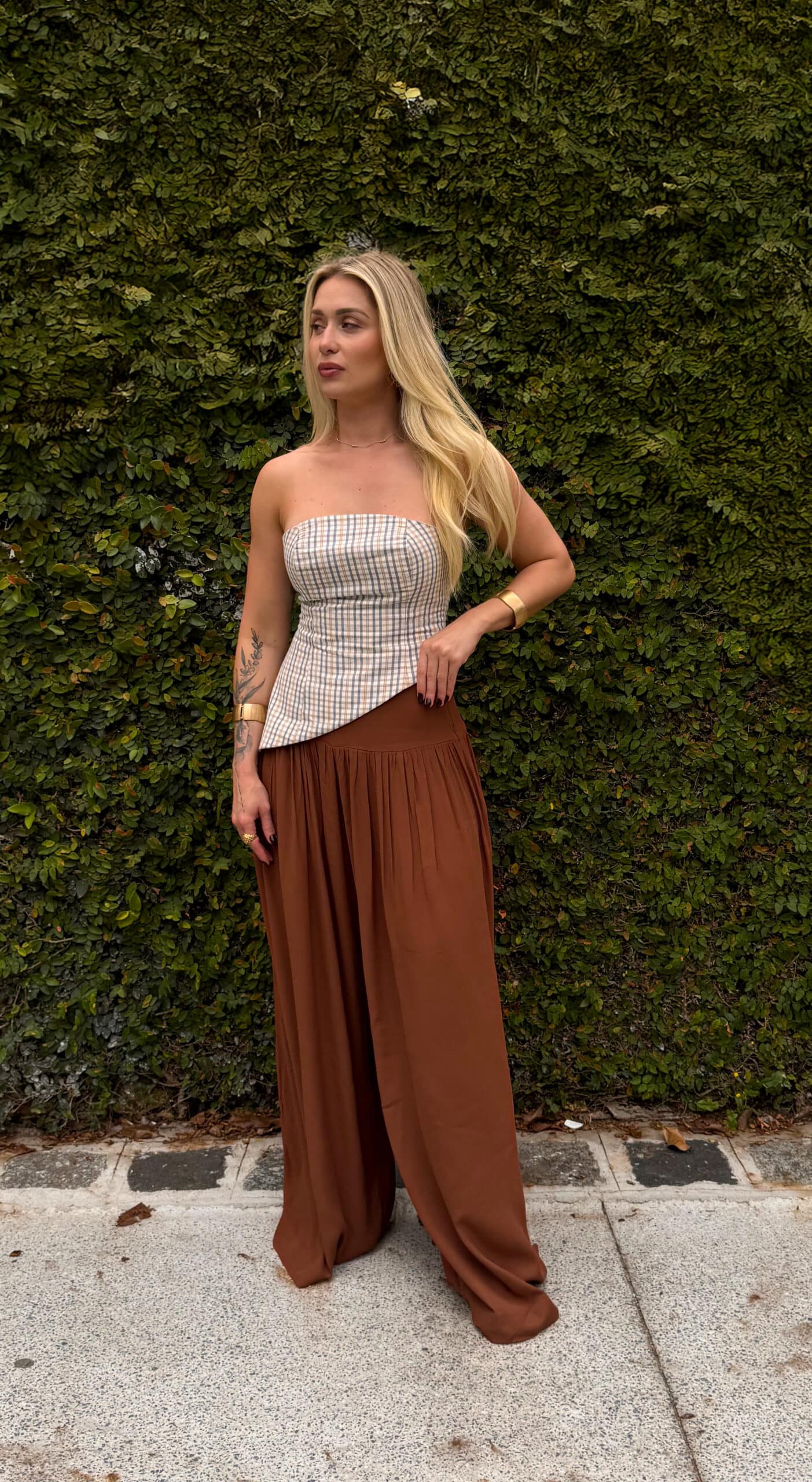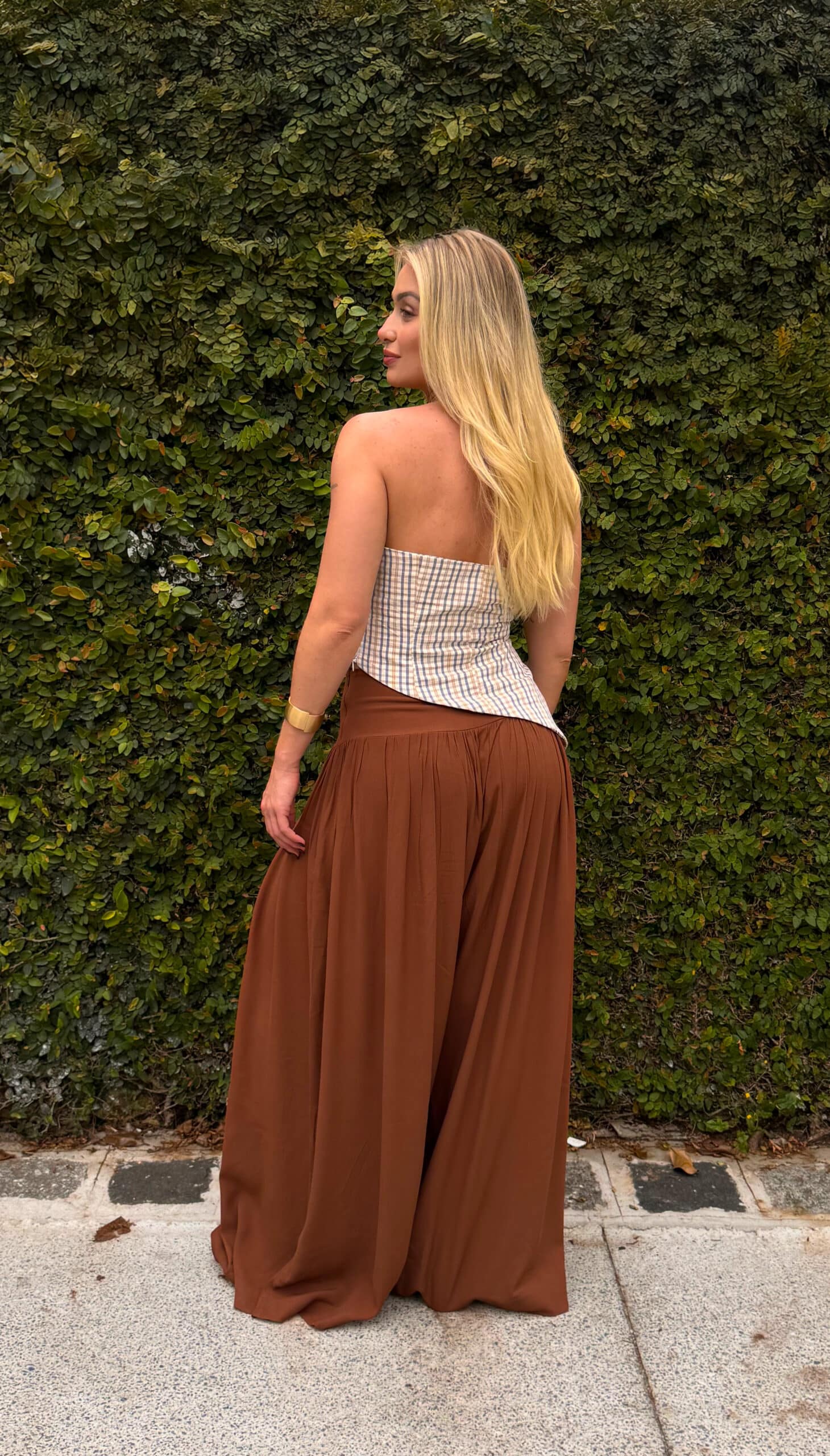 Calça pantalona Afrodite, ampla com franzido e pala larga.